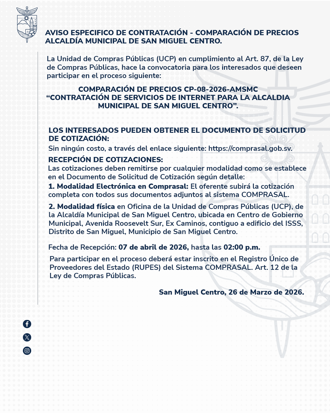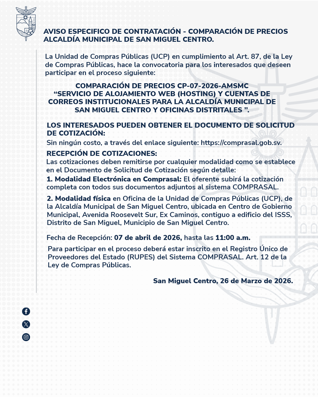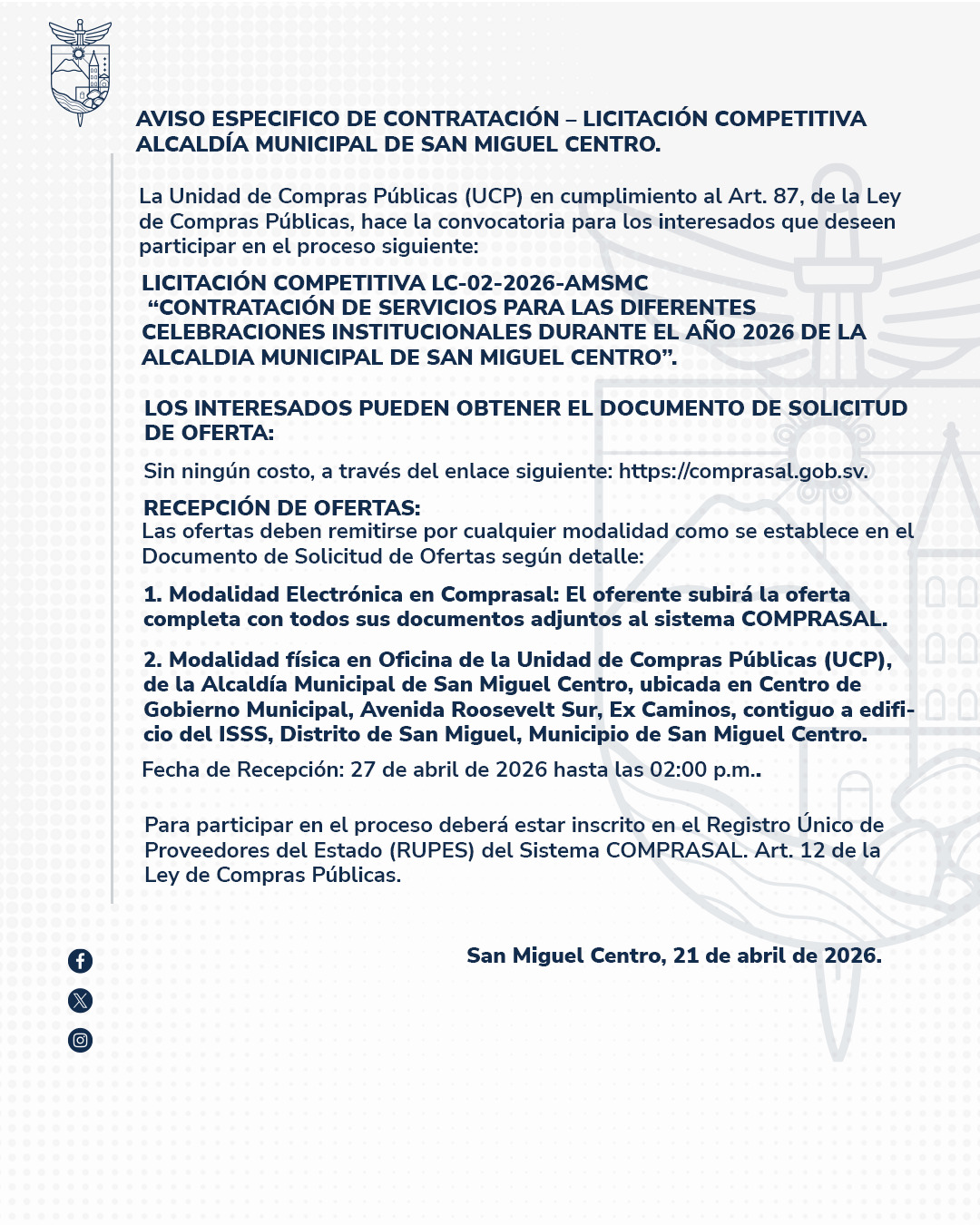 La Alcaldia Municipal de San Miguel Centro se pone a disposicion de apoyar a los ciudadanos en todas sus necesidades y preocupaciones. Con un enfoque centrado en el bienestar comunitario, estamos comprometidos a proporcionar servicios eficientes y de calidad.