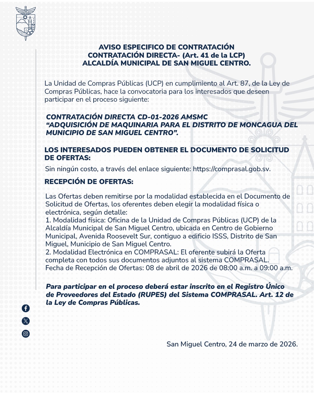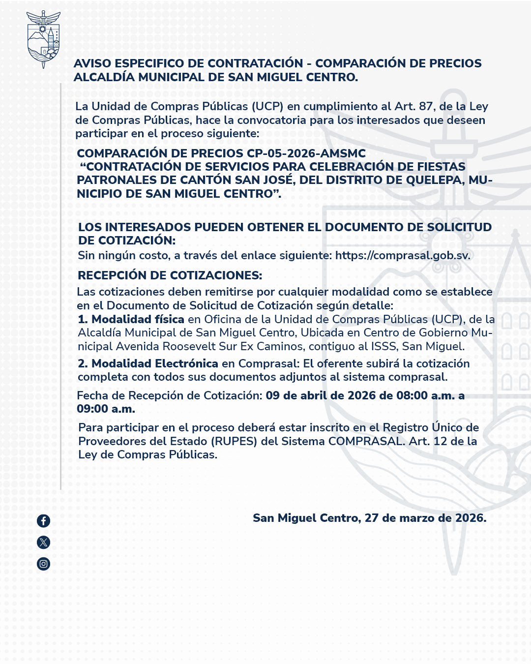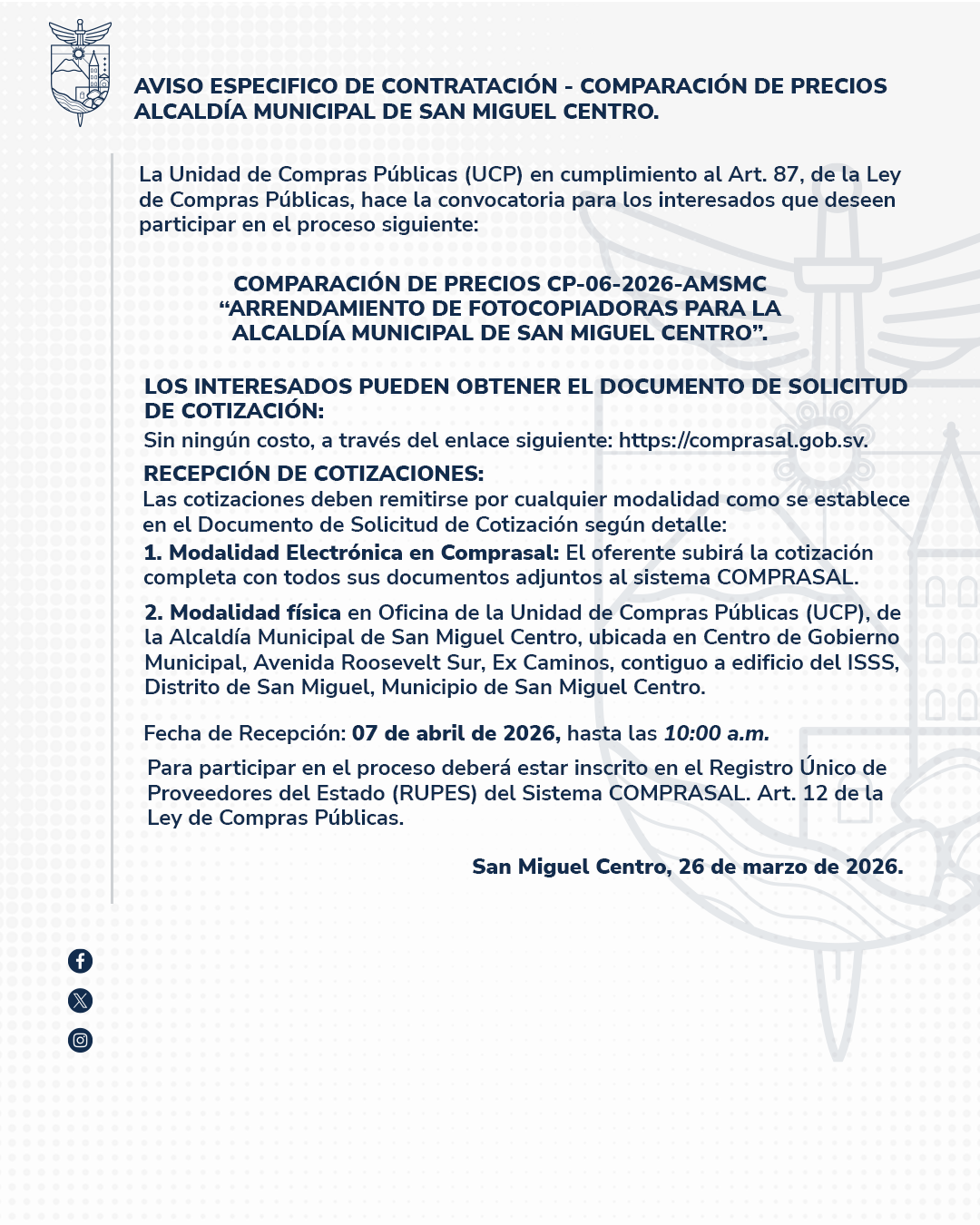 La Alcaldia Municipal de San Miguel Centro se pone a disposicion de apoyar a los ciudadanos en todas sus necesidades y preocupaciones. Con un enfoque centrado en el bienestar comunitario, estamos comprometidos a proporcionar servicios eficientes y de calidad.